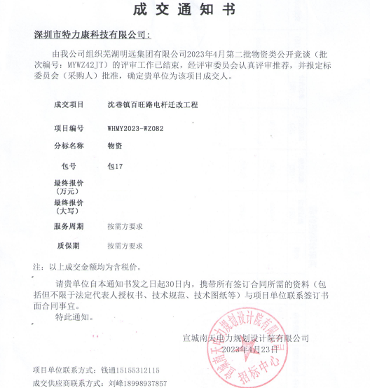 特力康中標(biāo)蕪湖明遠(yuǎn)集團(tuán)有限公司2023年4月第二批物資類公開競談成